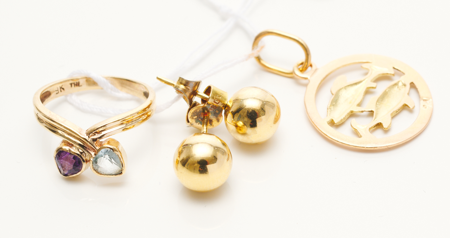 A COLLECTION OF THREE JEWELLERY, COMPRISING A PAIR OF EARRINGS IN 9CT GOLD(TO POST FITTINGS), A PISCES PENDANT IN 14CT GOLD, AND A RING (SIZE F) IN 9CT GOLD
