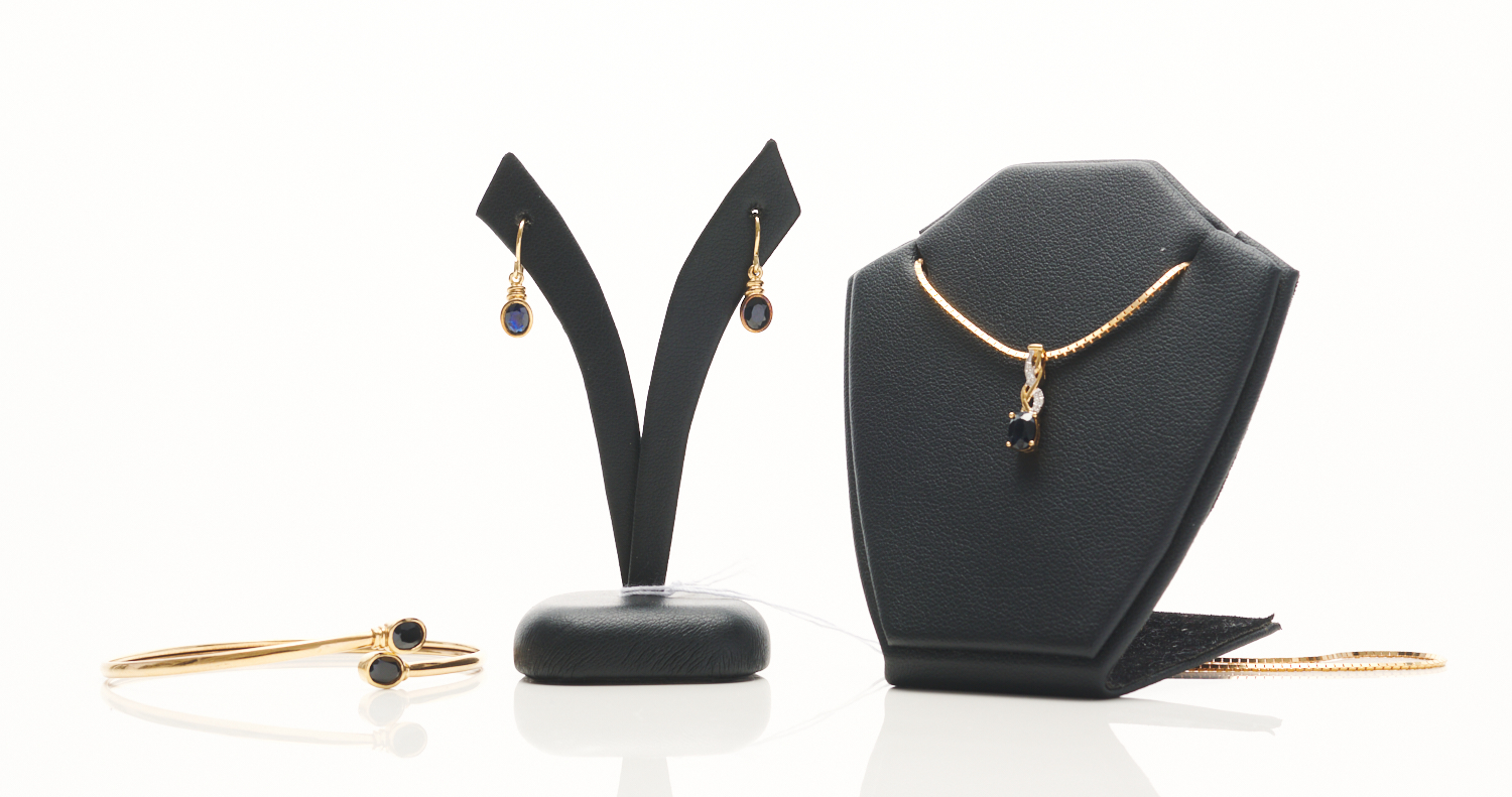 A SAPPHIRE JEWELLERY SUITE IN 9CT GOLD, COMPRISING A BANGLE, A NECKLACE AND A PAIR OF EARRINGS (TO HOOK FITTINGS), TOTAL WEIGHT 7GMS