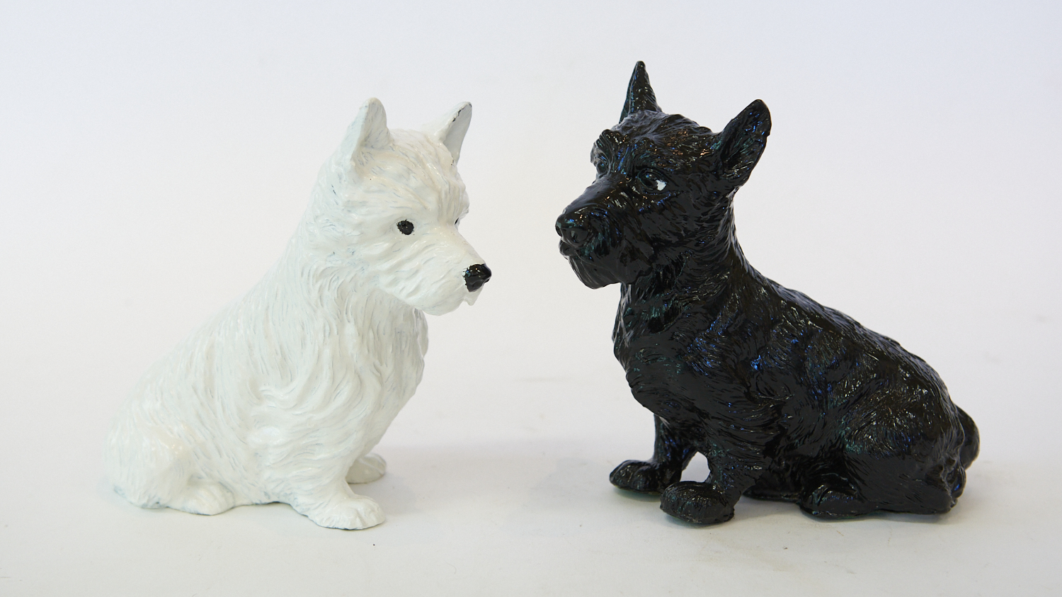 A PAIR OF BLACK AND WHITE WHISKY ADVERTISING DOGS (20 CM H), LEONARD JOEL LOCAL DELIVERY SIZE: SMALL