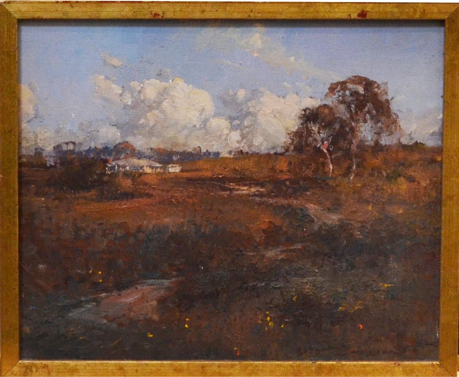 ROBERT SIMPSON, DRY SEASON WATTLE FLAT 1981, OIL ON BOARD, 24 X 29CM