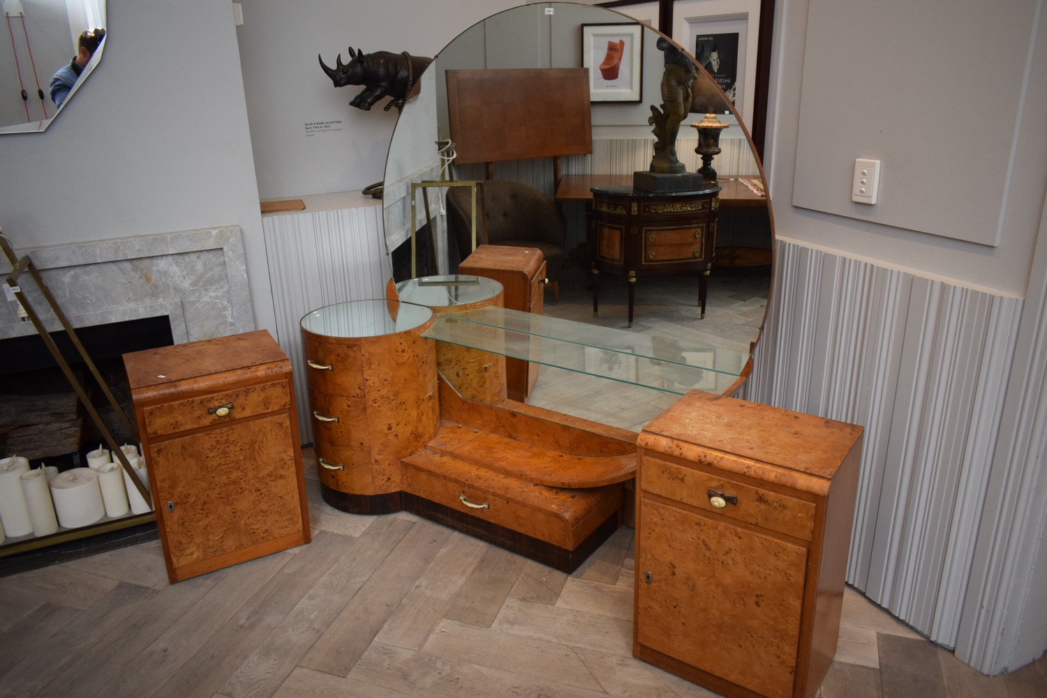 AN ART DECO BIRDSEYE MAPLE MIRRORED CONSOLE WITH MATCHING BEDSIDES (A/F) (170H X 157W X 50D) CABINETS 69H X 45W X 35D CM)