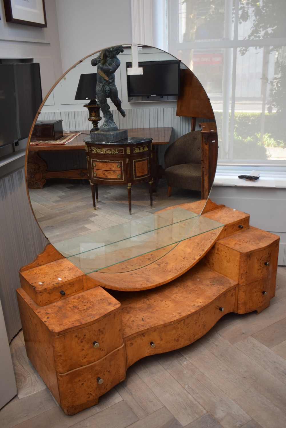 AN ART DECO MIRRORED CONSOLE IN BIRDSEYE MAPLE (A/F) 170H X 159W X 50D (PLEASE NOTE THIS HEAVY ITEM MUST BE REMOVED BY CARRIERS AT THE CUSTOMER'S EXPENSE. LEONARD JOEL STAFF CANNOT ASSIST CARRYING THIS ITEM) (X-LARGE ITEM)