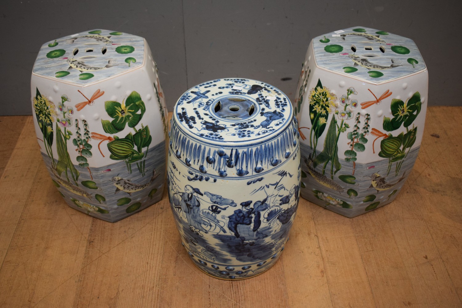 A PAIR OF CHINESE PORCELAIN DRUM FORM STOOLS TOGETHER WITH ONE SIMILAR (47H x 32D CM) (LEONARD JOEL DELIVERY SIZE: LARGE)