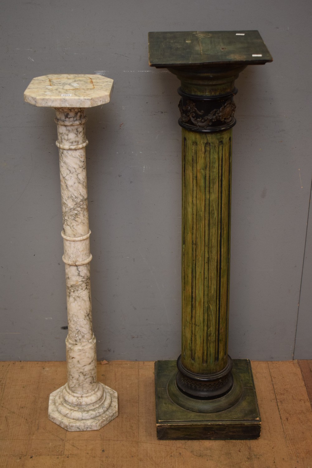 TWO CLASSICAL STYLE PEDESTALS, ONE TIMBER, ONE MARBLE (A/F) (H112 X W29 X D29 CM) (LEONARD JOEL DELIVERY SIZE: MEDIUM)