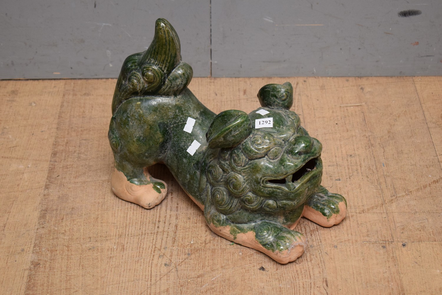 A GREEN GLAZED FO DOG FIGURE (31H x 34W CM) (LEONARD JOEL DELIVERY SIZE: SMALL)
