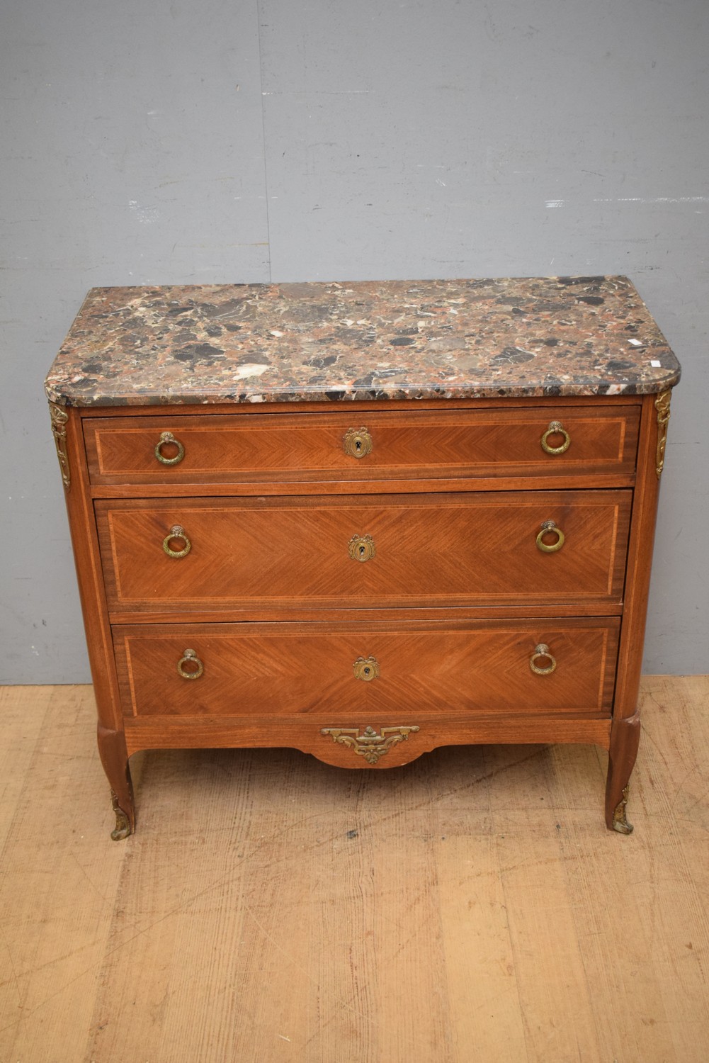 A LOUIS XV STYLE MARBLE TOP COMMODE (85H x 93W x 46D CM) (PLEASE NOTE THIS HEAVY ITEM MUST BE REMOVED BY CARRIERS AT THE CUSTOMER'S EXPENSE. LEONARD JOEL STAFF CANNOT ASSIST CARRYING THIS ITEM) (X-LARGE ITEM)