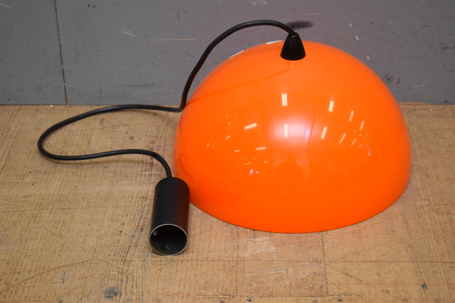A 1970S PLASTIC DOME PENDANT LIGHT IN ORANGE (H19 X W22 CM) (LEONARD JOEL DELIVERY SIZE: SMALL)