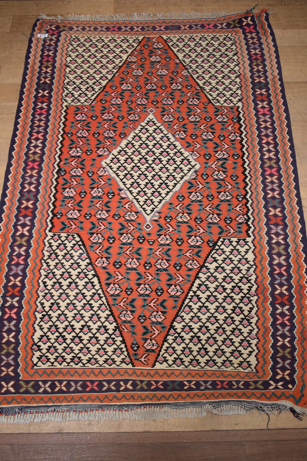 A MULIT COLOURED WOOLEN RUG (A/F) (180 X 116 CM) (LEONARD JOEL DELIVERY SIZE: MEDIUM)