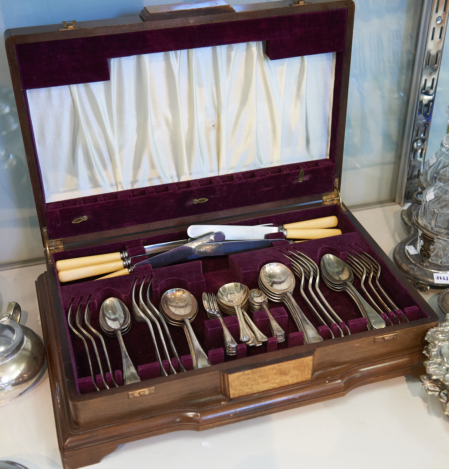 A SILVERPLATE CUTLERY SETTING FOR SIX PLUS EXTRAS IN ART DECO CANTEEN, LEONARD JOEL LOCAL DELIVERY SIZE: SMALL