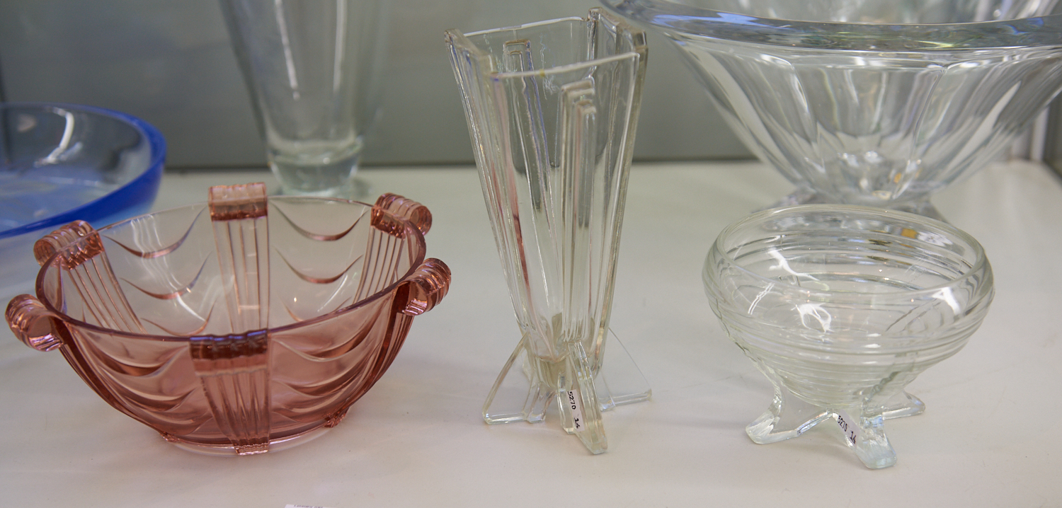 A GROUP OF THREE PRESSED ART DECO GLASS ITEMS (A/F TO RIM OF PINK BOWL), LEONARD JOEL LOCAL DELIVERY SIZE: SMALL
