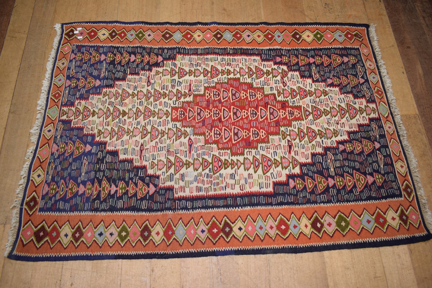 A MULTI COLOURED WOOLEN FLOOR RUG (A/F) (160 x 113 CM) (LEONARD JOEL DELIVERY SIZE: MEDIUM)