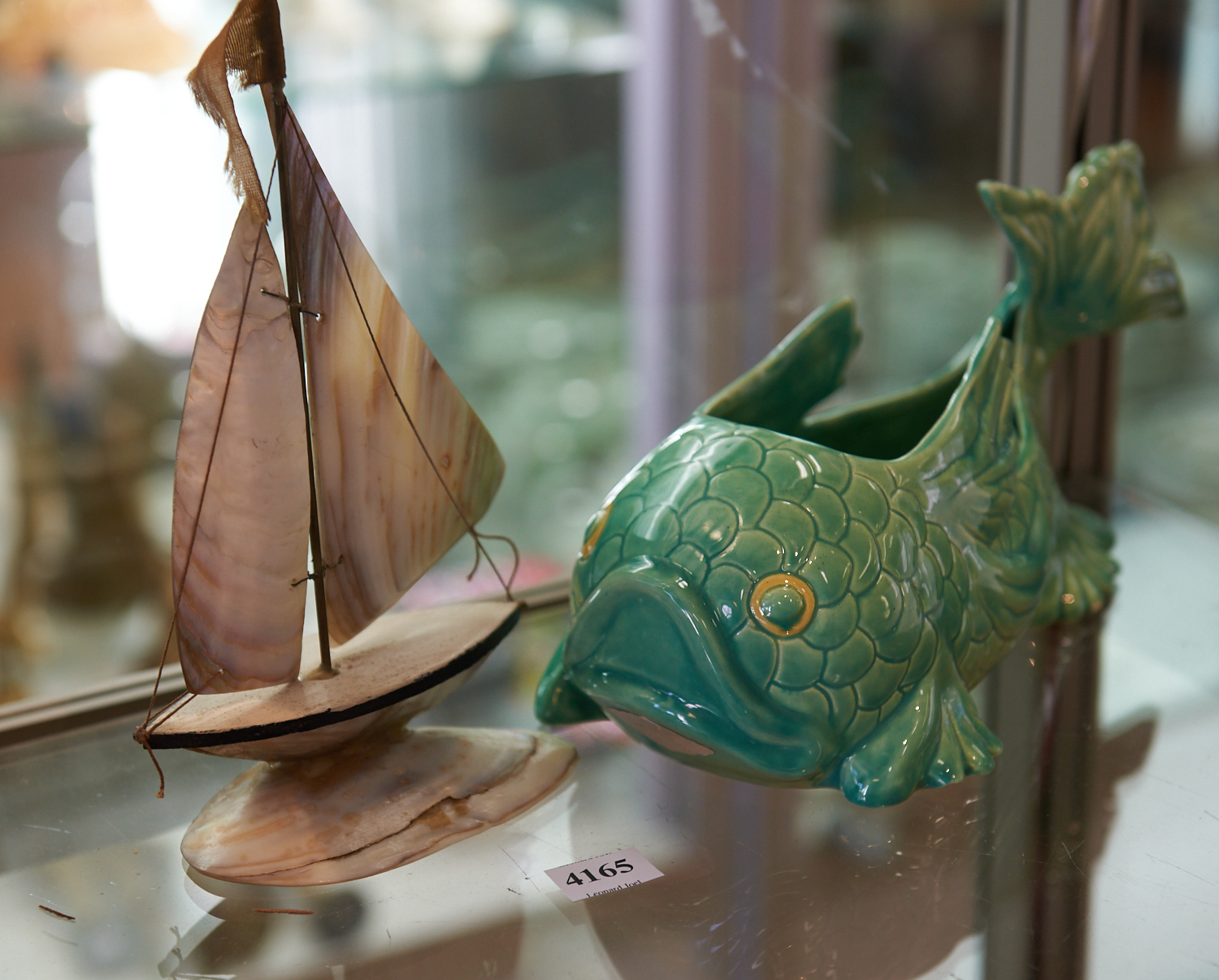 A CERAMIC FISH TOGETHER WITH SHELL ART SHIP, LEONARD JOEL LOCAL DELIVERY SIZE: SMALL