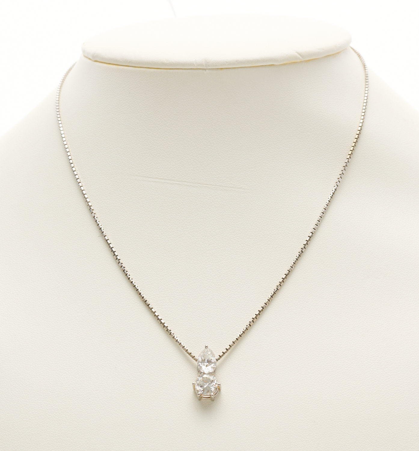 A DIAMOND PENDANT WITH CHAIN IN 18CT WHITE GOLD, COMPRISING A ROUND BRILLIANT CUT DIAMOND OF 1.00CT/G-H/SI1 AND A PEAR CUT DIAMOND OF 0.80CT/F-G/SI1, 5.6GMS