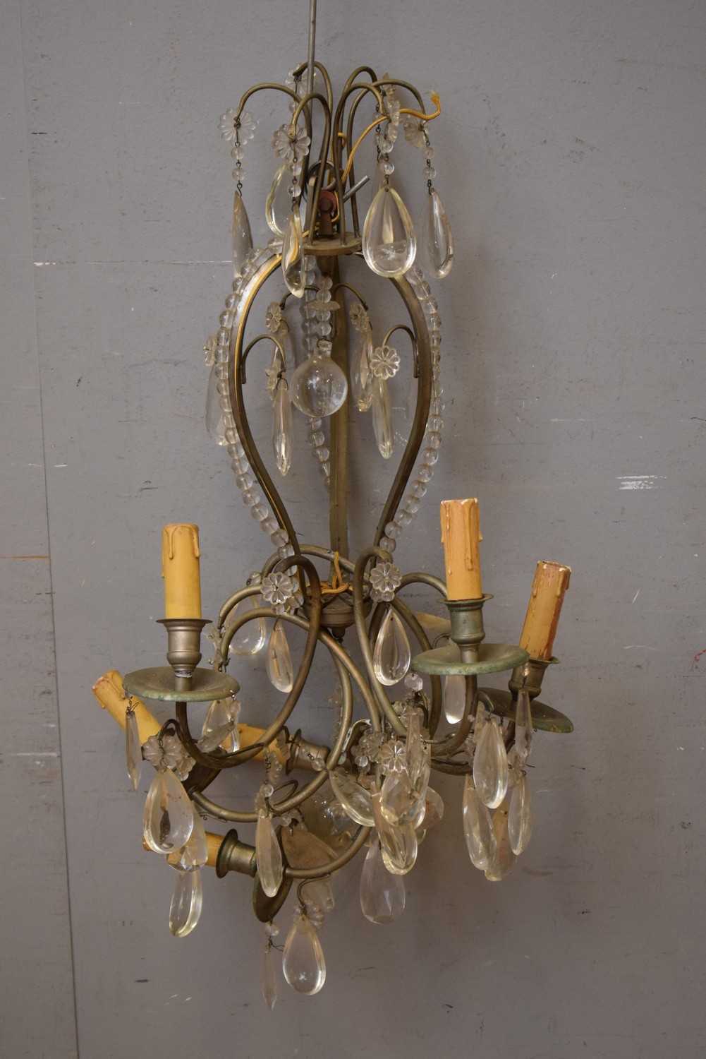 A FRENCH BRONZE CRYSTAL & GLASS 6 BRANCH CHANDELIER C.1950'S (A/F) (74H CM APPROX) (LEONARD JOEL DELIVERY SIZE: LARGE)
