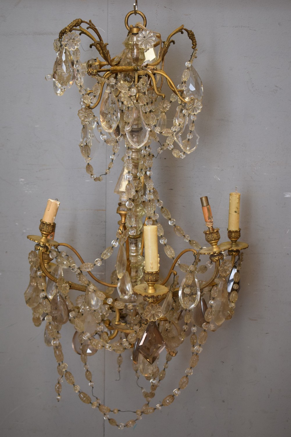 A FRENCH NEOCLASSICAL 6 BRANCH BRONZE & CRYSTAL CHANDELIER C.1930'S (A/F) (86H CM APPROX) (LEONARD JOEL DELIVERY SIZE: LARGE)