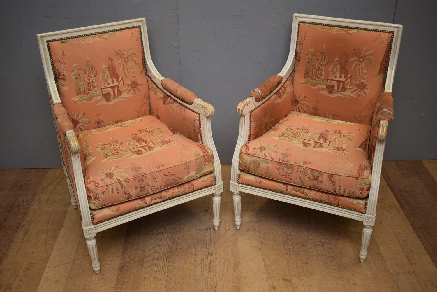 PAIR OF FRENCH LOUIS XVI MANNER PAINTED BERGERES, C.1940'S (A/F) (91H x 63W x 63D CM) (LEONARD JOEL DELIVERY SIZE: LARGE)