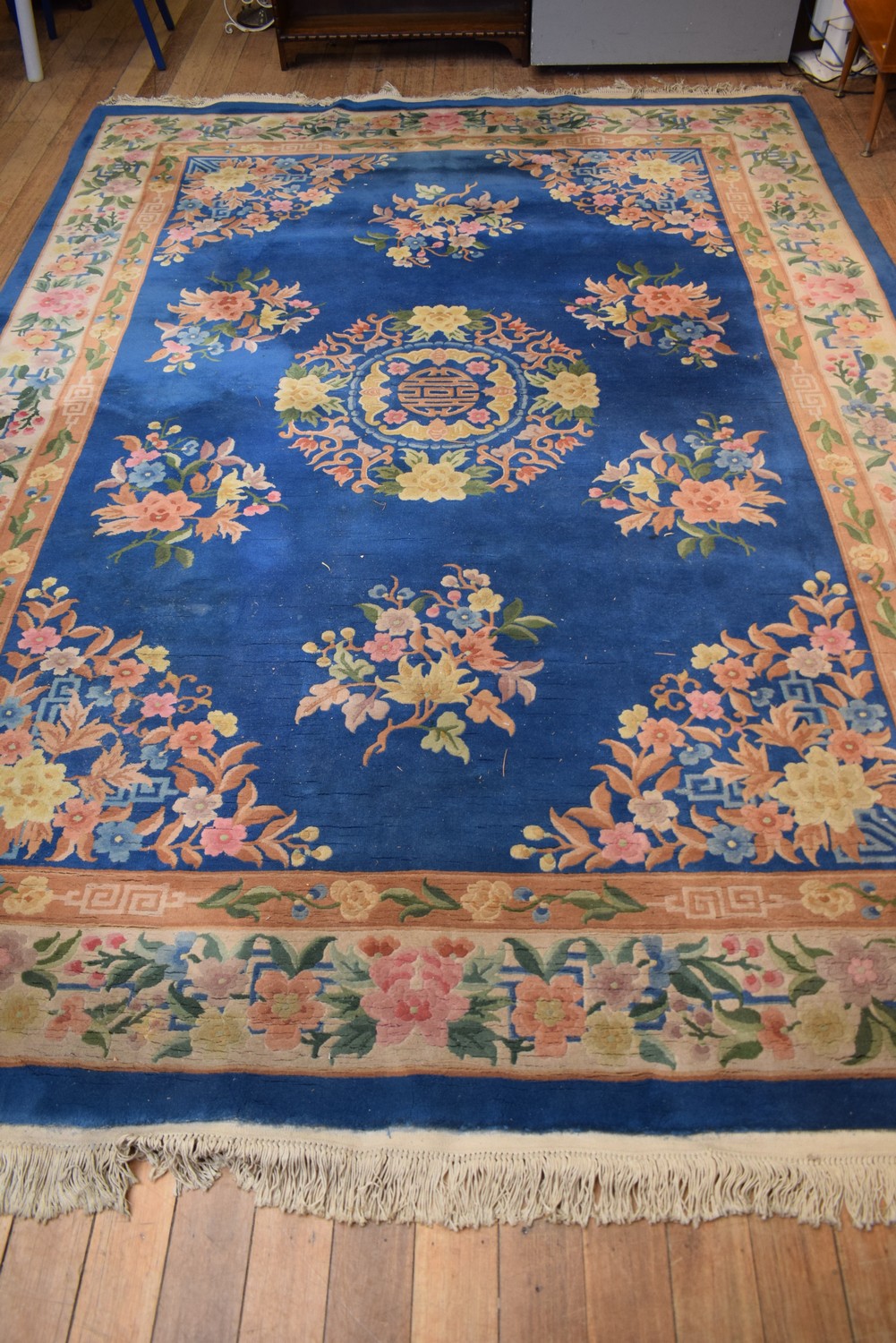 A LARGE WOOLLEN RUG IN BLUE TONES (A/F) (350 X 248 CM) (LEONARD JOEL DELIVERY SIZE: LARGE)