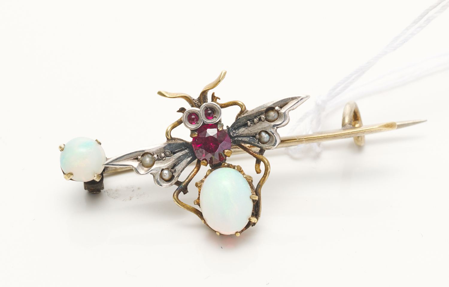 AN INSECT BROOCH SET WITH OPALS AND GARNETS IN GILT, TOTAL LENGTH 40MM