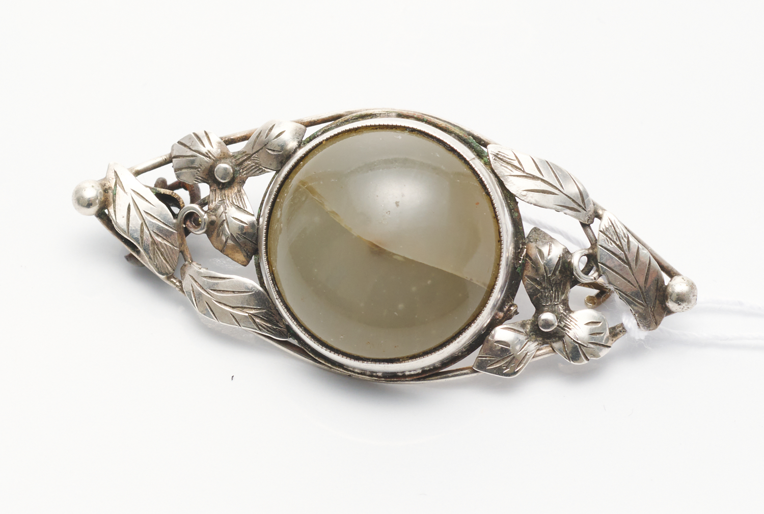 AN AGATE BROOCH IN STERLING SILVER, IN THE MANNER OF RHODA WAGER, LENGTH 45MM