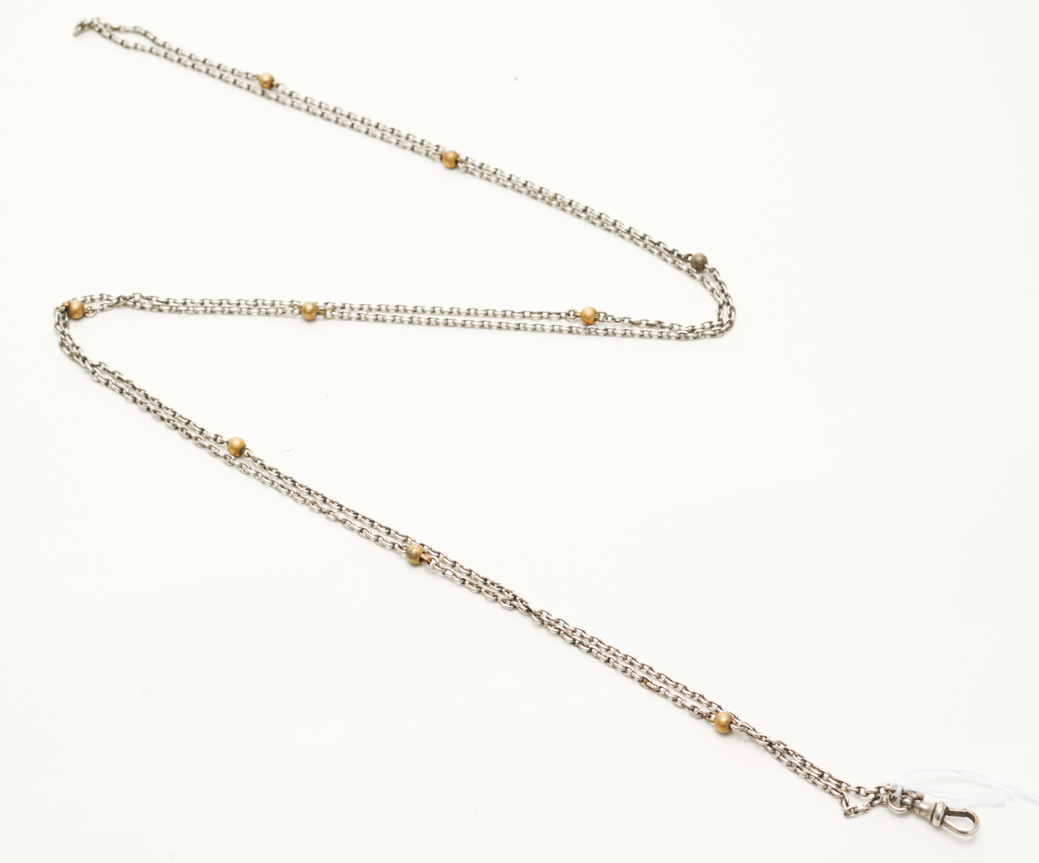 A SILVER GUARD CHAIN WITH BEADS IN GILT, LENGTH 138CMS