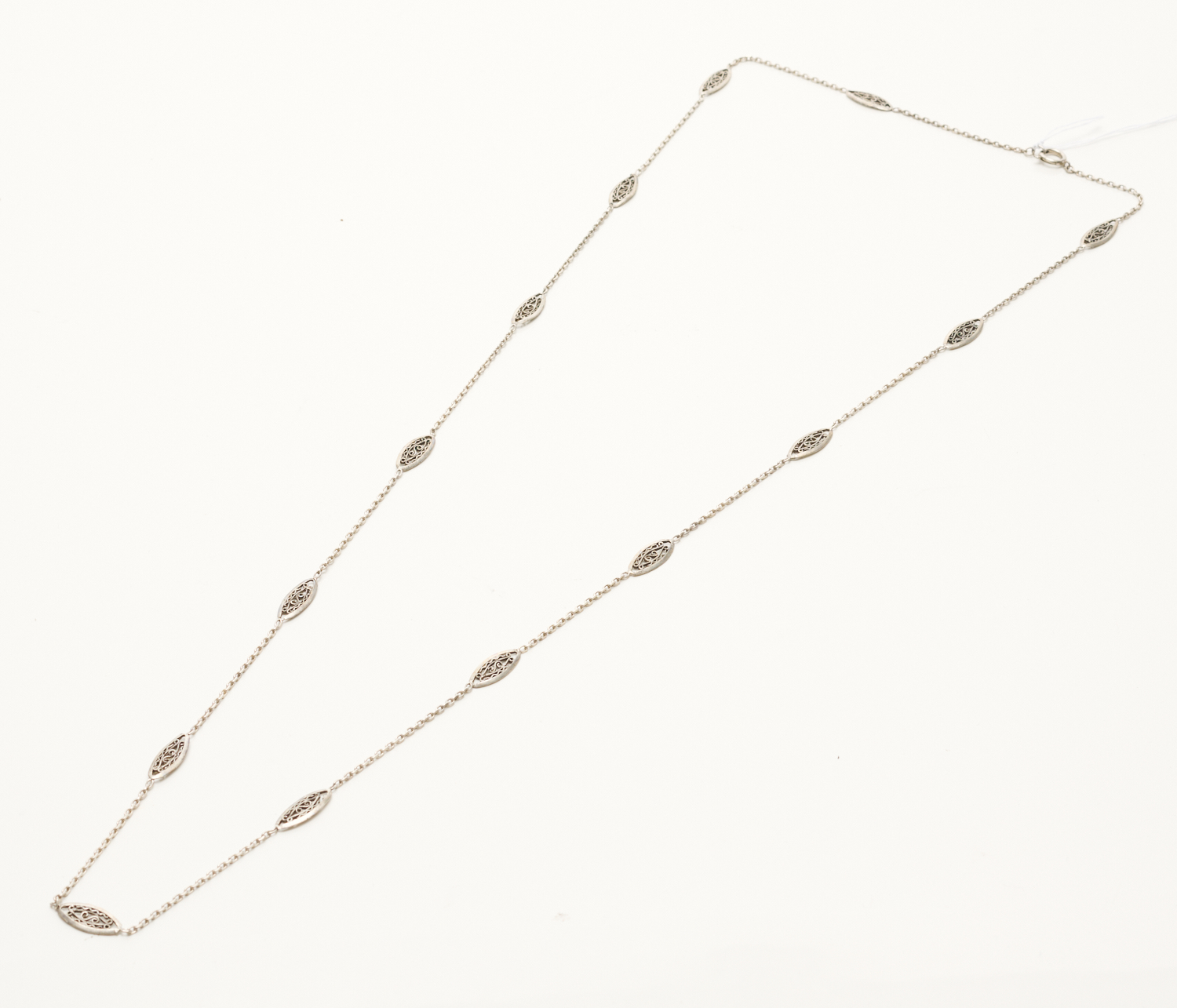 A LONG FANCY LINK CHAIN IN SILVER WITH FILIGREE DETAILS, LENGTH 96CM