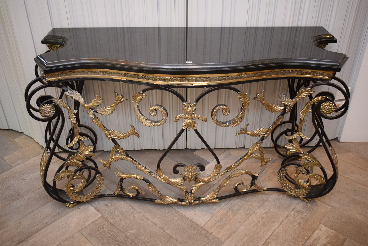 A DECORATIVE MARBLE TOP AND WROUGHT IRON CONSOLE (A/F) (H88 x W169 X D53 CM) (PLEASE NOTE THIS HEAVY ITEM MUST BE REMOVED BY CARRIERS AT THE CUSTOMER'S EXPENSE. LEONARD JOEL STAFF CANNOT ASSIST CARRYING THIS ITEM) (X-LARGE ITEM)