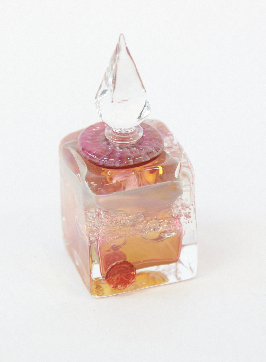 A RICHARD CLEMENTS ART GLASS PERFUME BOTTLE OF SQUARE FORM WITH POINTED STOPPER, H.9.8CM, LEONARD JOEL LOCAL DELIVERY SIZE: SMALL