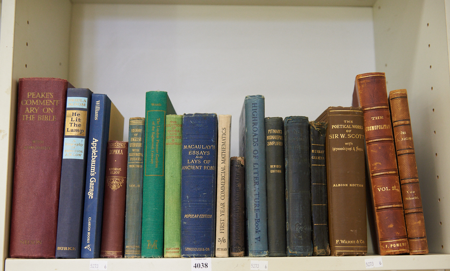 A SHELF OF LEATHER AND CANVAS BOUND BOOKS, LEONARD JOEL LOCAL DELIVERY SIZE: SMALL