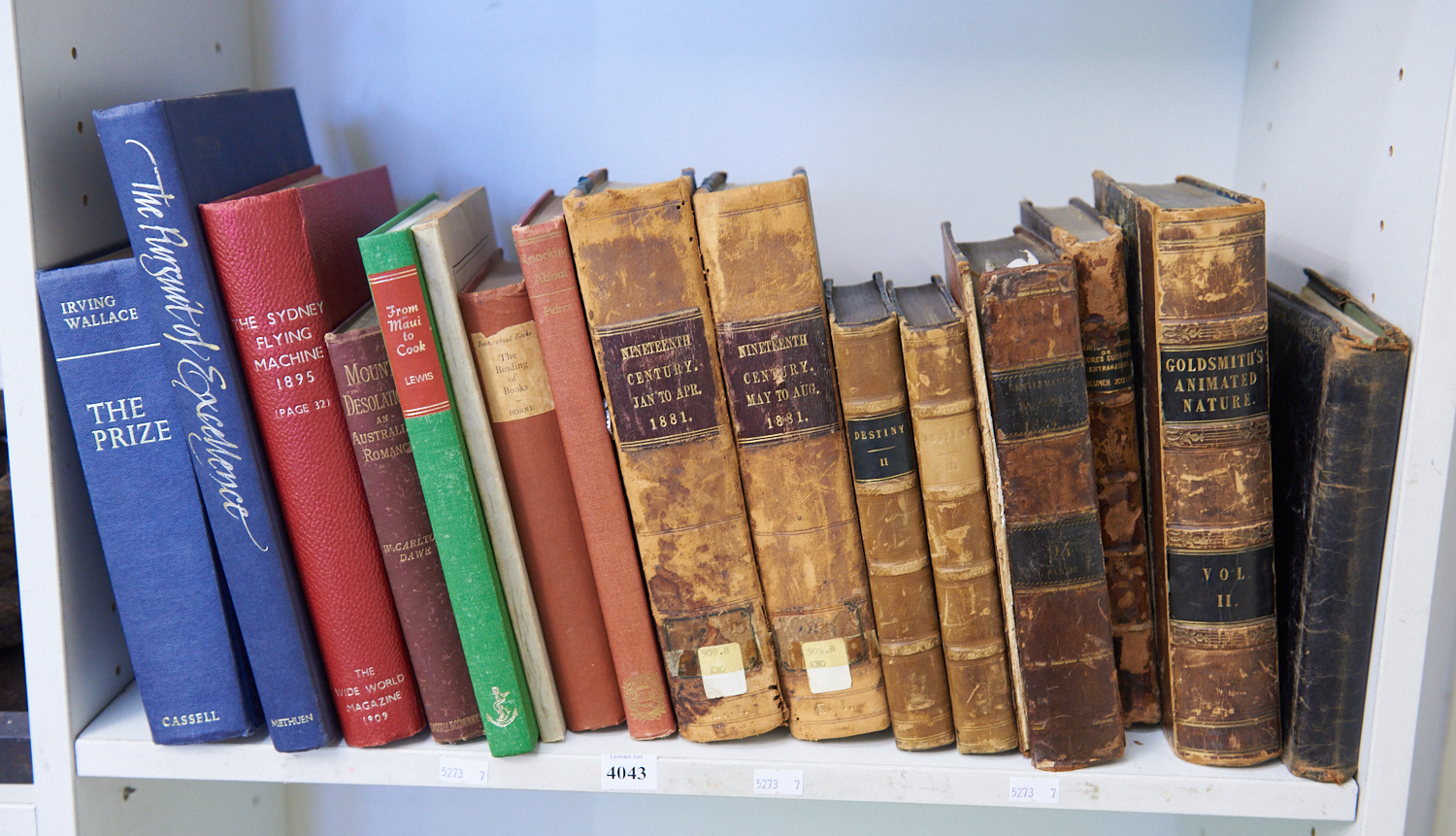 A SHELF OF LEATHER AND CANVAS BOUND BOOKS, LEONARD JOEL LOCAL DELIVERY SIZE: SMALL