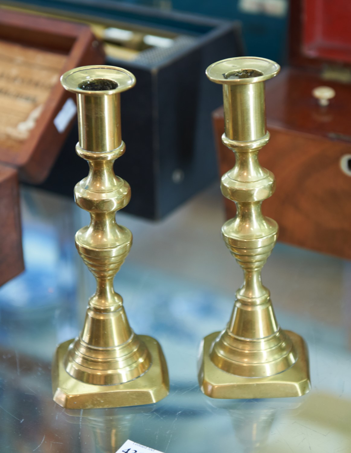 A PAIR OF BRASS CANDLESTICKS H.20 CM, LEONARD JOEL LOCAL DELIVERY SIZE: SMALL