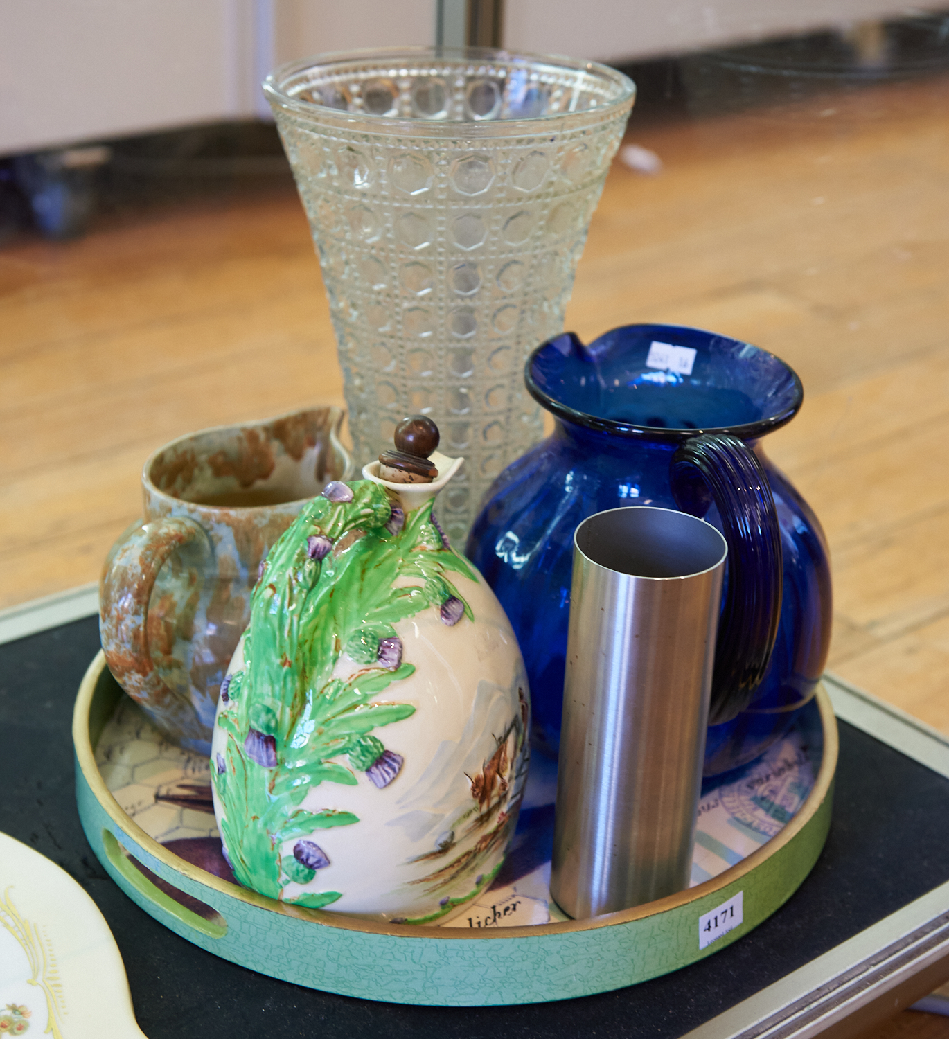 A GROUP OF ASSORTED VASES AND JUGS INCLUDING GEORG JENSEN, LEONARD JOEL LOCAL DELIVERY SIZE: SMALL