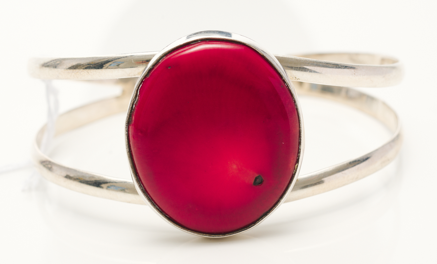 A DYED CORAL BANGLE IN MEXICAN SILVER