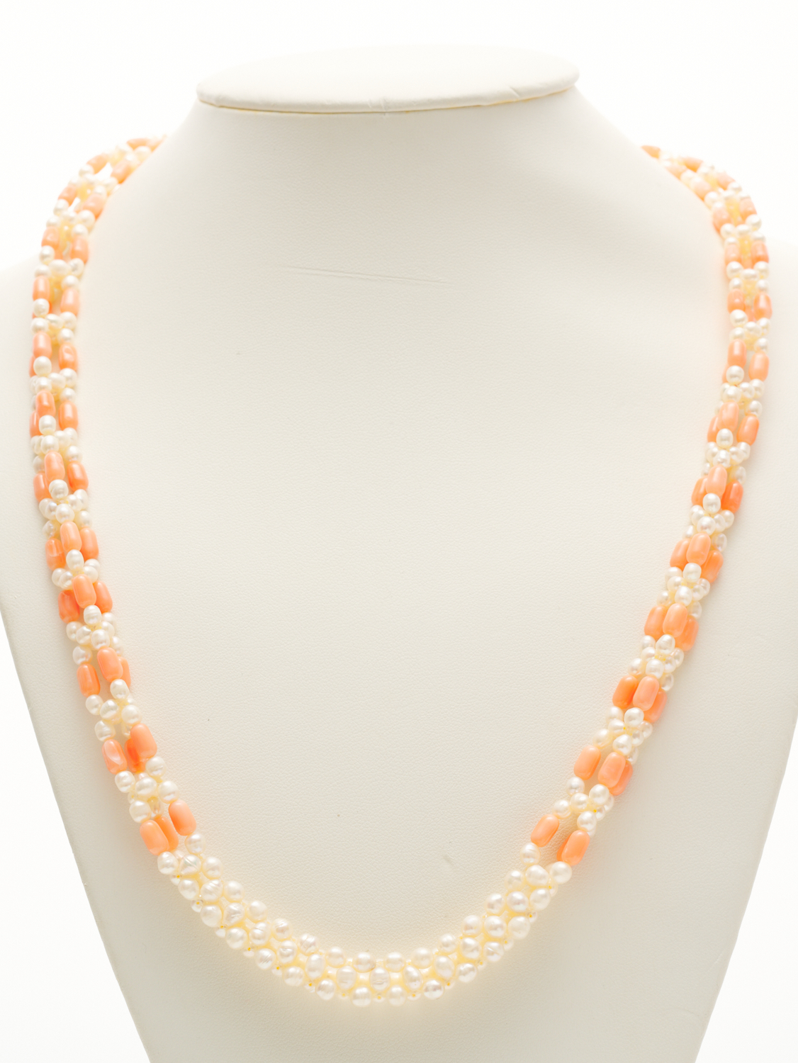 A FRESHWATER PEARL AND CORAL NECKLACE TO A SILVER PEARL SET CLASP, LENGTH 63CMS