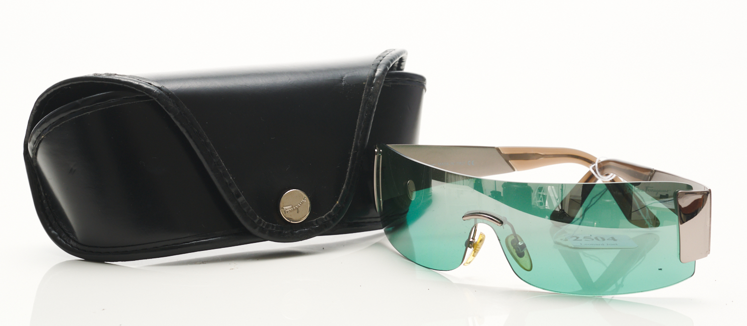 A PAIR OF RETRO SUNGLASSES BY SALVATORE FERRAGAMO WITH CASE AND BOX.
