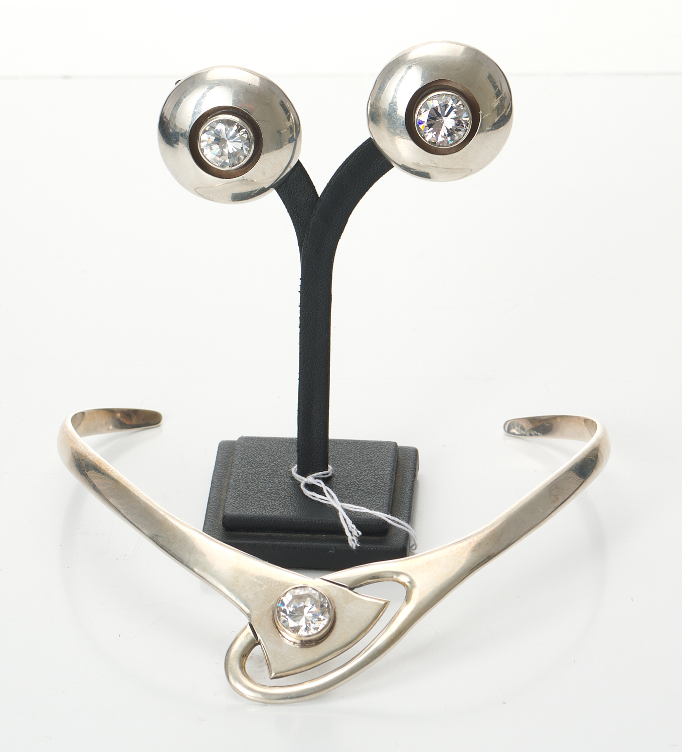 A WHITE PASTE MEXICAN SILVER JEWELLERY SUITE COMPRISING A COLLAR DIAMETER 290MM, AND A PAIR OF CLIP EARRINGS, DIAMETER 29MM)