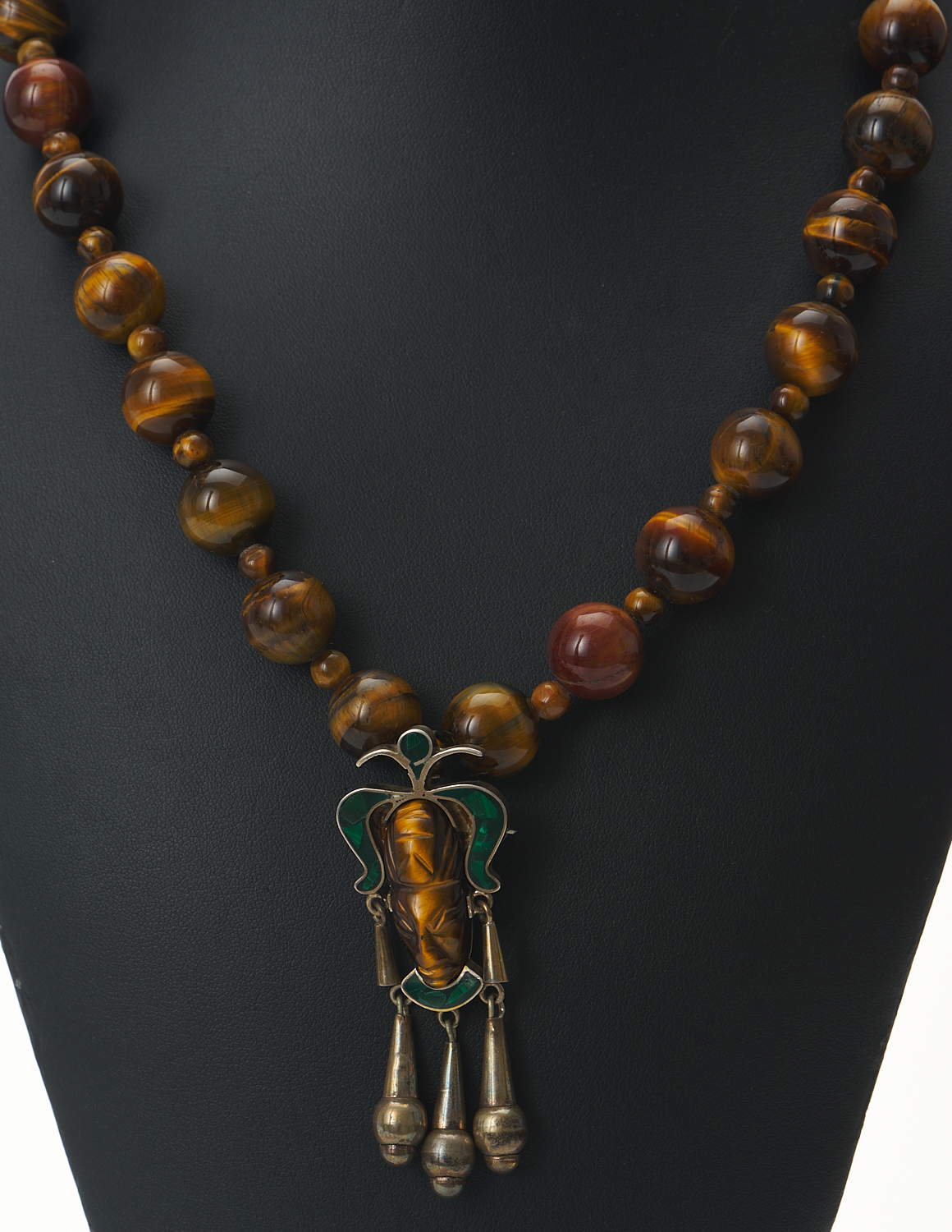 A TIGERS EYE NECKLACE WITH A TAXCO MEXICAN SILVER MALACHITE AND TIGERS EYE PENDANT / BROOCH, TOTAL LENGTH 660MM