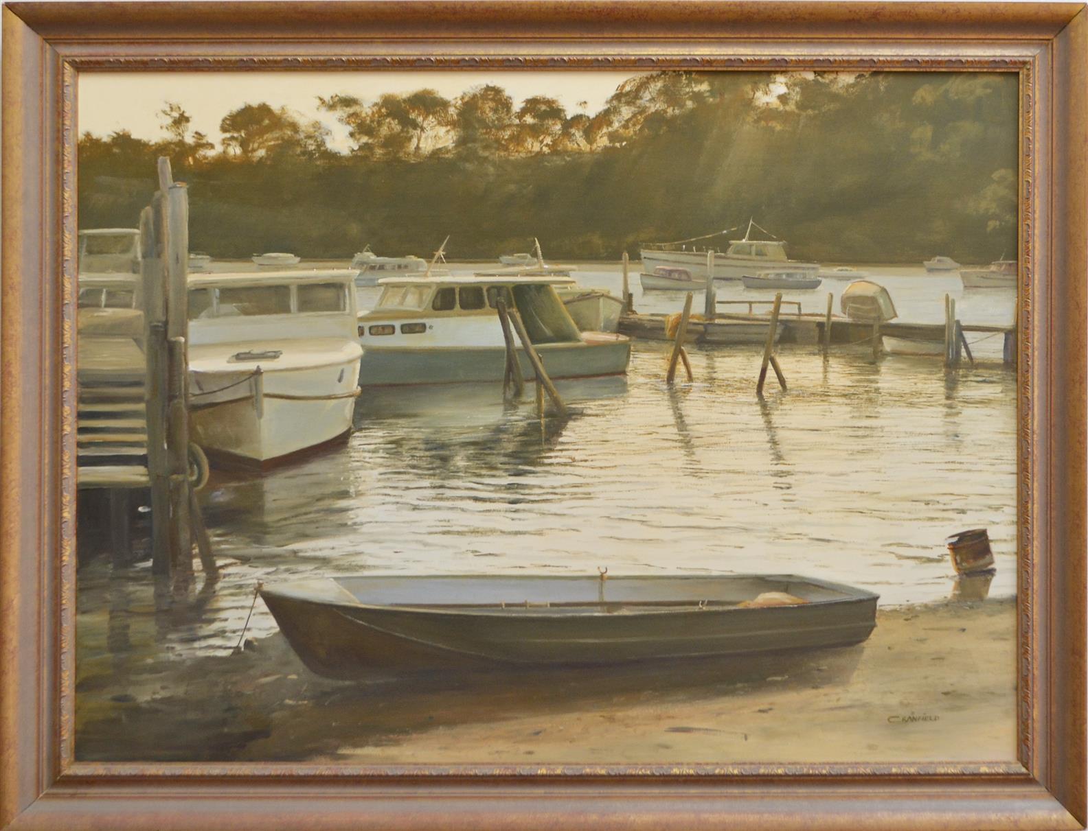 SIGNED CRANFIELD, MOORED BOATS, OIL ON CANVASBOARD, 90 X 120CM
