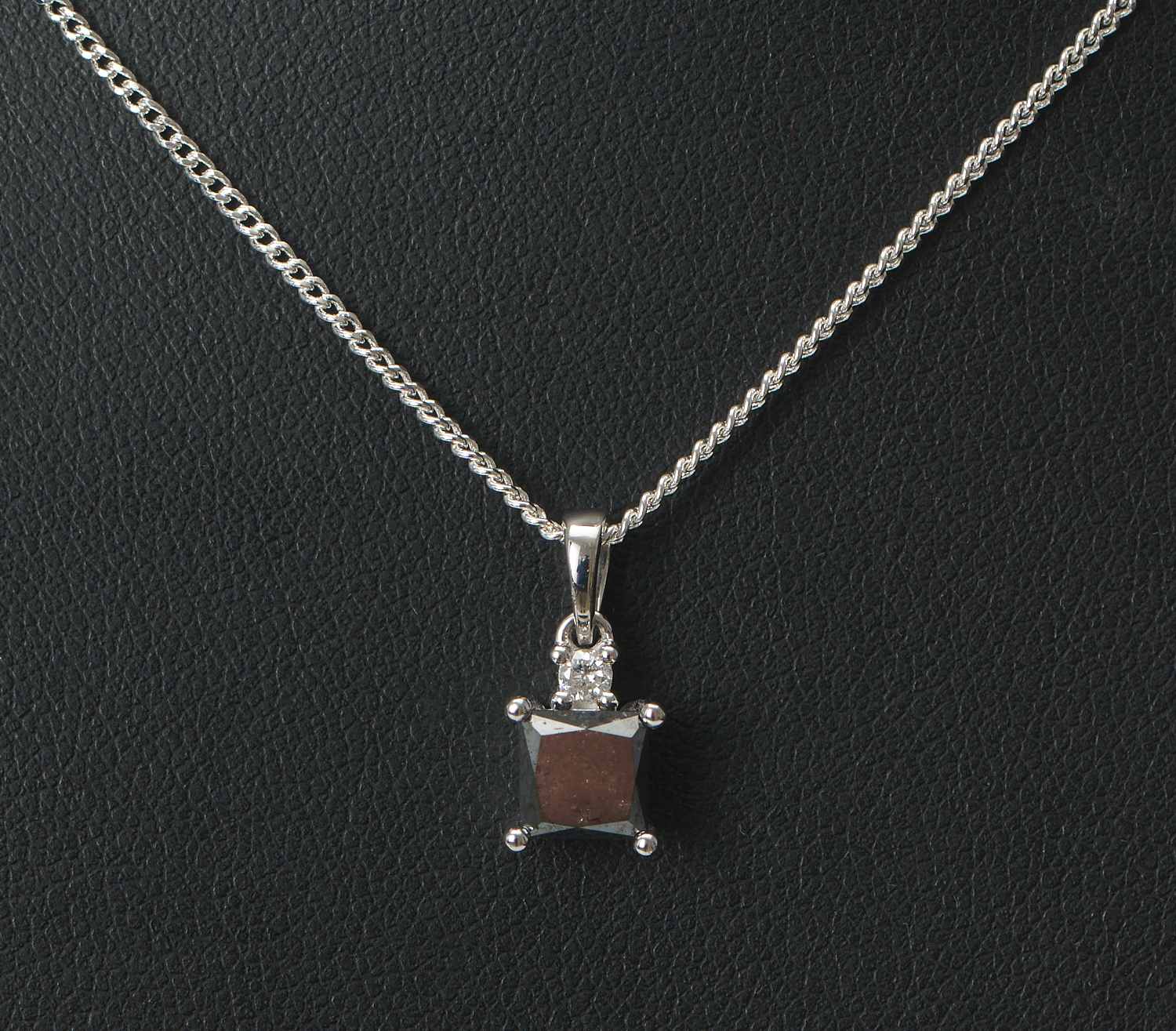 A BLACK AND WHITE DIAMOND PENDANT IN 14CT WHITE GOLD, THE SQUARE CUT BLACK DIAMOND ESTIMATED 1.23CTS, SUSPENDED FROM A DIAMOND SET BALE, TO A DISPLAY CHAIN, 3.4GMS
