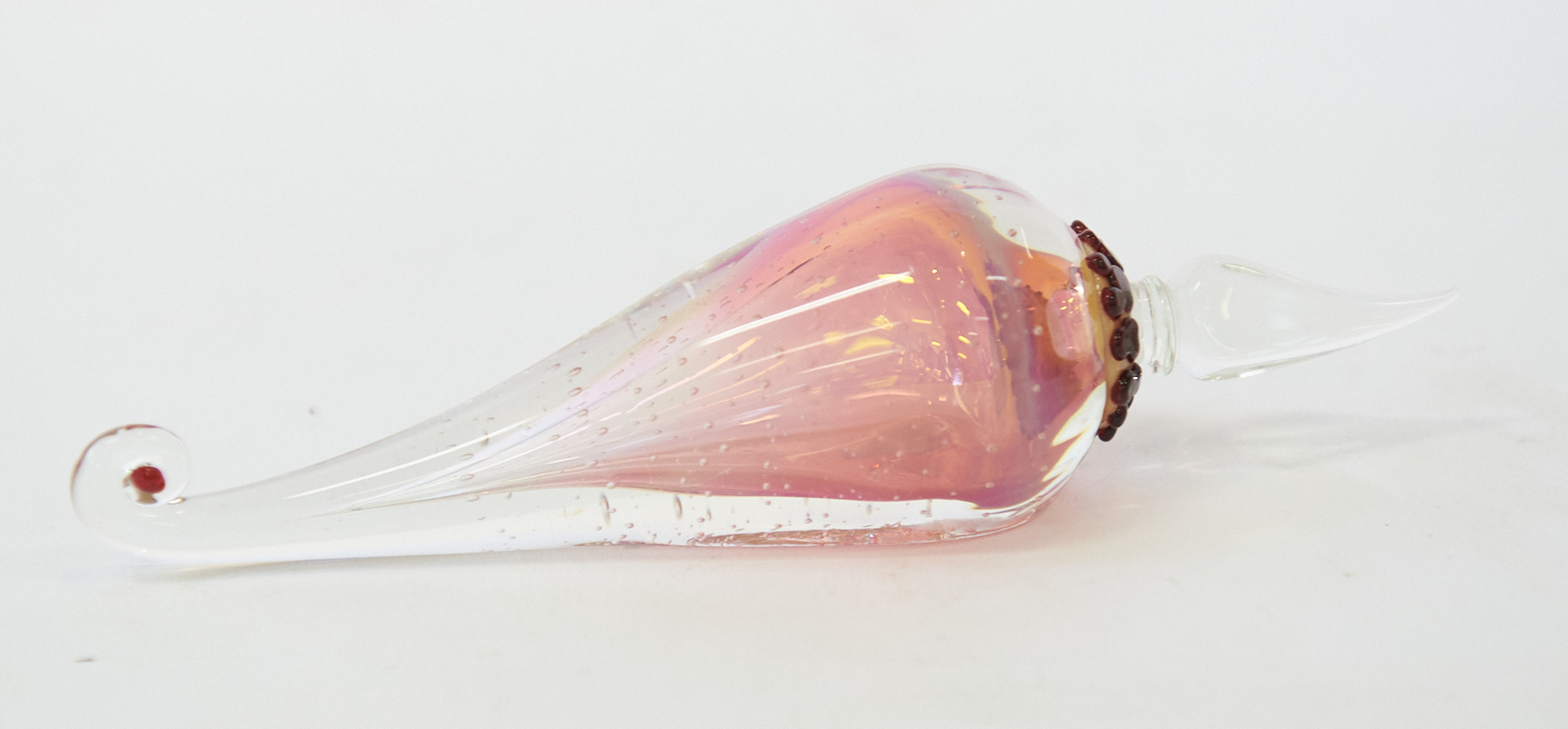 A RICHARD CLEMENTS ART GLASS PERFUME BOTTLE OF SHELL FORM IN PINK TONES WITH AMBER COLLAR AND POINTED STOPPER, L.16.2CM, LEONARD JOEL LOCAL DELIVERY SIZE: SMALL