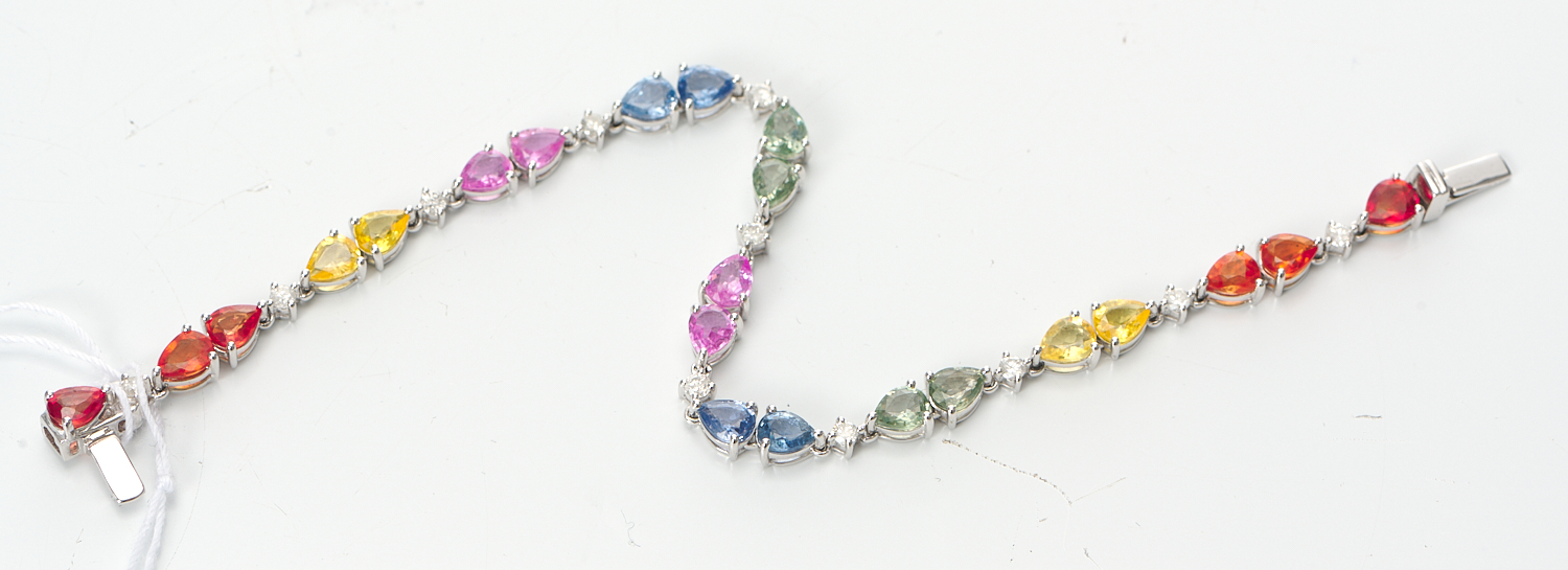 A MULTI-COLOURED SAPPHIRE AND DIAMOND BRACELET IN 14CT WHITE GOLD, LENGTH: 17CM