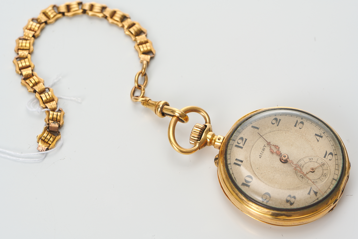 A 'JUST' OPENFACE POCKET WATCH WITH CHAIN IN 18CT GOLD, LE COULTRE MOVEMENT, DIAMETER: 43MM, 66.5GMS