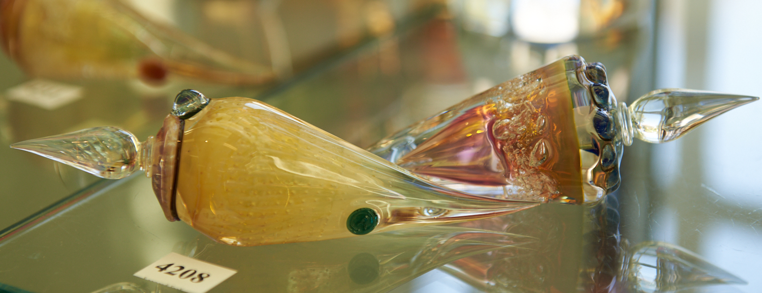 TWO RICHARD CLEMENTS ART GLASS PERFUME BOTTLES OF SHELL FORM WITH STOPPERS, L.16.2CM, LEONARD JOEL LOCAL DELIVERY SIZE: SMALL