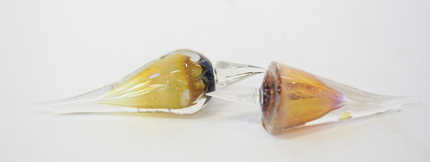 TWO RICHARD CLEMENTS ART GLASS PERFUME BOTTLES OF SHELL FORM IN SHADES OF PINK WITH LONG STOPPERS, L.14.4CM AND L.16.2CM, LEONARD JOEL LOCAL DELIVERY SIZE: SMALL