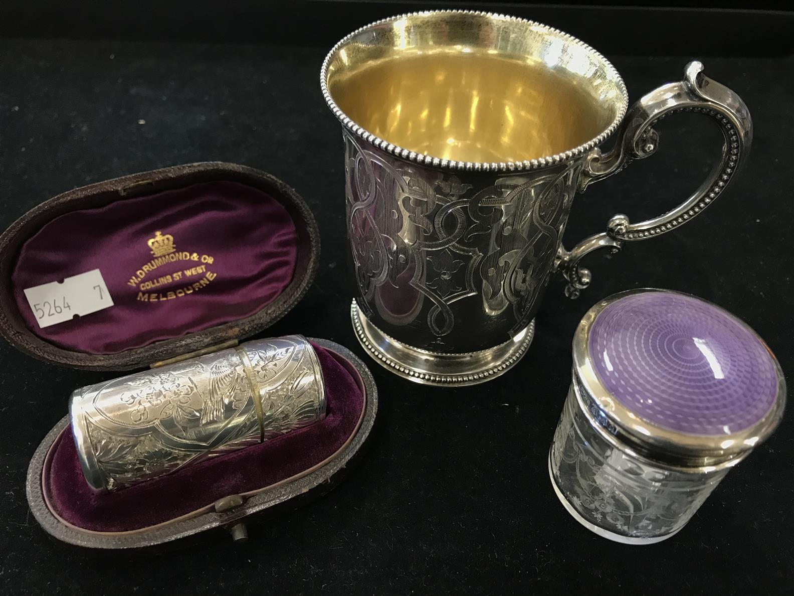 A GROUP OF SILVER INCLUDING STERLING SILVER CHRISTENING MUG (LONDON 1863), SILVER CASED PERFUME BOTTLE IN LEATHER CASE, AND GUILLOCHE BOX