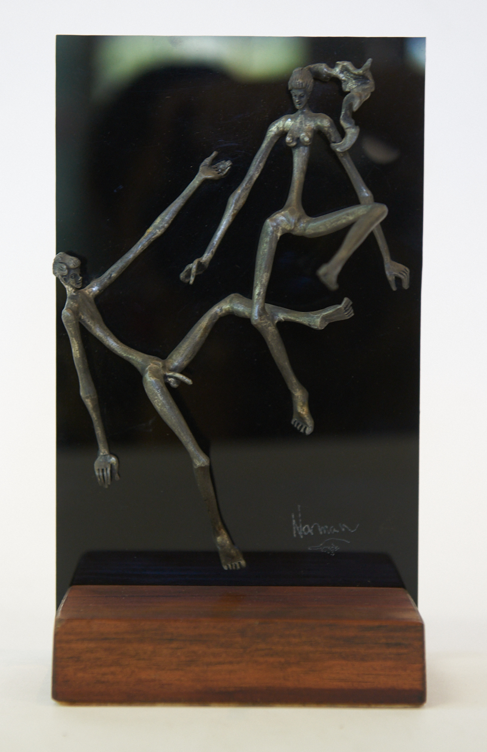 A MODERN NORMAN RABINOWITZ PEWTER SCULPTURE OF TWO DANCING DOLLS. 22CM HIGH