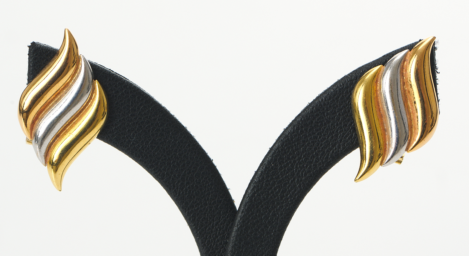 A PAIR OF FOLIATE DESIGN EARRINGS IN TRI-COLOUR 18CT GOLD, TO POST AND CLIP FITTINGS, LENGTH 20MM, 4.3GMS