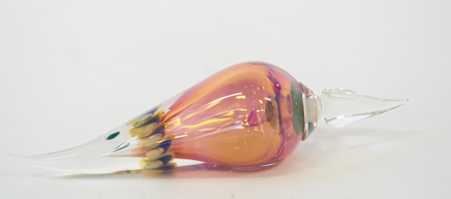 A RICHARD CLEMENTS ART GLASS PERFUME BOTTLE OF SHELL FORM WITH POINTED STOPPER, L.18CM, LEONARD JOEL LOCAL DELIVERY SIZE: SMALL