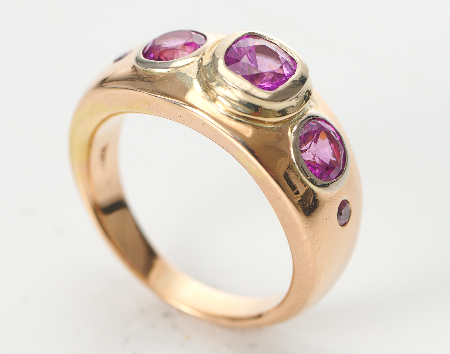 The centre pink sapphire estimated 0.85ct, shouldered by two round cut totalling approximately 1.00ct;