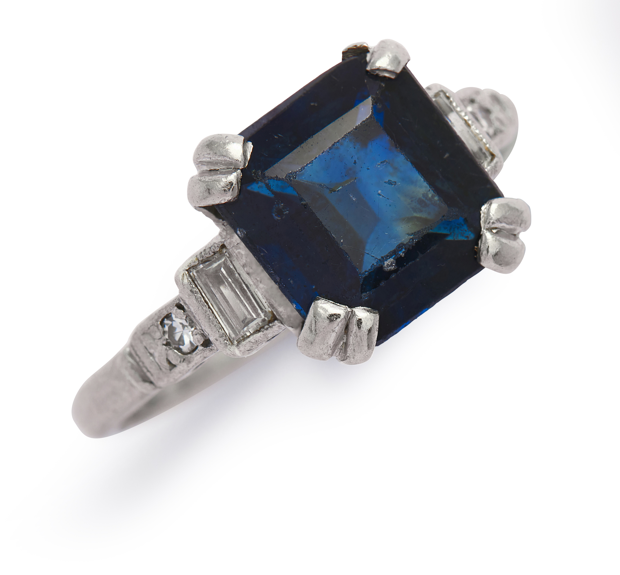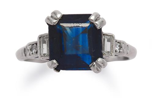 The square-cut sapphire weighing approximately 2.41 carats is claw-set between baguette and circular-cut diamond shoulders, the diamonds together weighing approximately 0.10 carat, size I1/2.