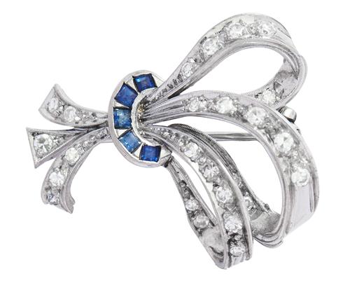 Of ribbon and bow design decorated with circular-cut diamonds and carré-cut sapphires, the sapphires and diamonds together weighing approximately 0.20 and 0.50 carat respectively, length 30mm.
